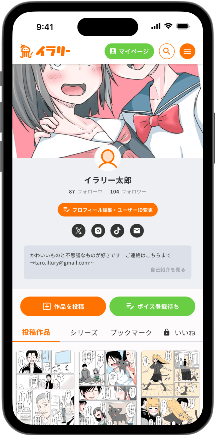 イラリーでは、イラストやマンガだけでなく、音声作品や縦読み形式のWebtoonにも対応しており、幅広いジャンルの作品を自由に投稿できます。さらに、イラストやマンガに音声を組み合わせて、見るだけでなく、聞いて楽しむ新しい作品をユーザーみんなで共有できます。